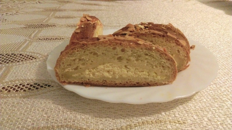 3. Ciasto dzielimy na 2 części. Z każdą z tych części postępujemy tak samo: rozwałkowujemy na prostokąt około 20×30 cm, przekładamy na papier do pieczenia, nacinamy z obu stron paski o szerokości około 2 cm, środka nie naruszamy i wykładamy na niego połowę przygotowanego wcześniej nadzienia. Potem zaplatamy nad nim ciasto. Takie strucle przenosimy na blachę. Przykrywamy je ściereczką, odstawiamy w ciepłe miejsce na około 30 minut.