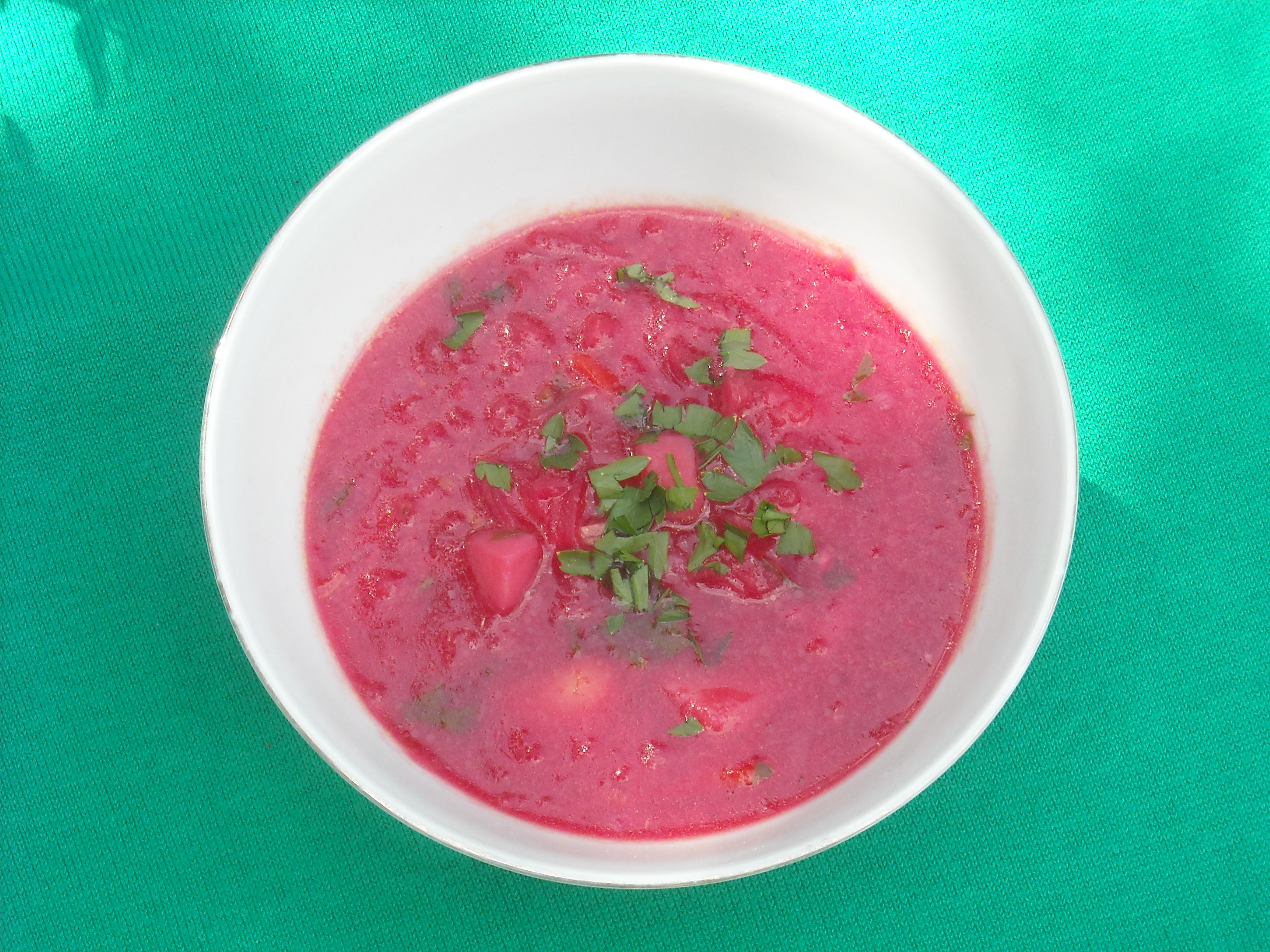 Dodajemy obraną i pokrojoną w plasterki marchewkę, obraną pietruszkę, pokrojonego w paseczki pora oraz kapustę. Następnie dodać posiekaną w drobną kosteczkę cebulę oraz obrane i pokrojone w kosteczkę ziemniaki (ziemniaki można wcześniej podgotować – żeby nie były surowe 😛 ). Zagotowujemy i dodajemy fasolkę z puszki, a po 5 minutach starte buraczki, natkę pietruszki oraz przecier pomidorowy. Jeszcze raz zagotowujemy, zdejmujemy z ognia i wlewamy sok z cytryny (zatrzyma kolor zupy). Staramy się jak najmniej zupę podgrzewać po dodaniu buraczków, gdyż spowoduje to utratę jej intensywnego koloru i przechodzenie z bordowego w czerwono – pomarańczowy.
