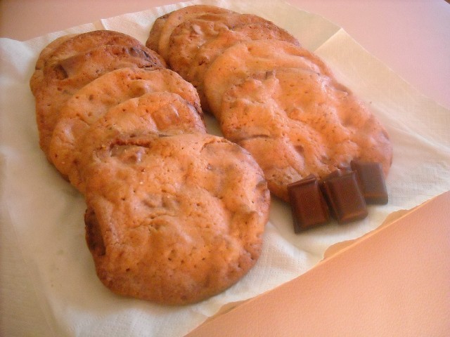 Mąkę przesiewamy do miski, mieszamy sól, sodę i cukier wanilinowy. W drugiej misce ubijamy masło z dodatkiem brązowego i białego cukru (można dodać mniej cukru – ciasteczka są baardzo słodkie). Dodajemy jajko i ubijamy jeszcze przez 5 minut. Dodajemy sypkie składniki i miksujemy, dodajemy posiekaną czekoladę i mieszamy dłonią lub łyżką.