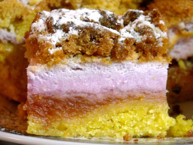4. Piankę wykładamy na masę jabłkową. Układamy kawałki schłodzonego ciasta. Pieczemy ok. 45 minut w 180 st.C. Studzimy. Posypujemy cukrem pudrem.
