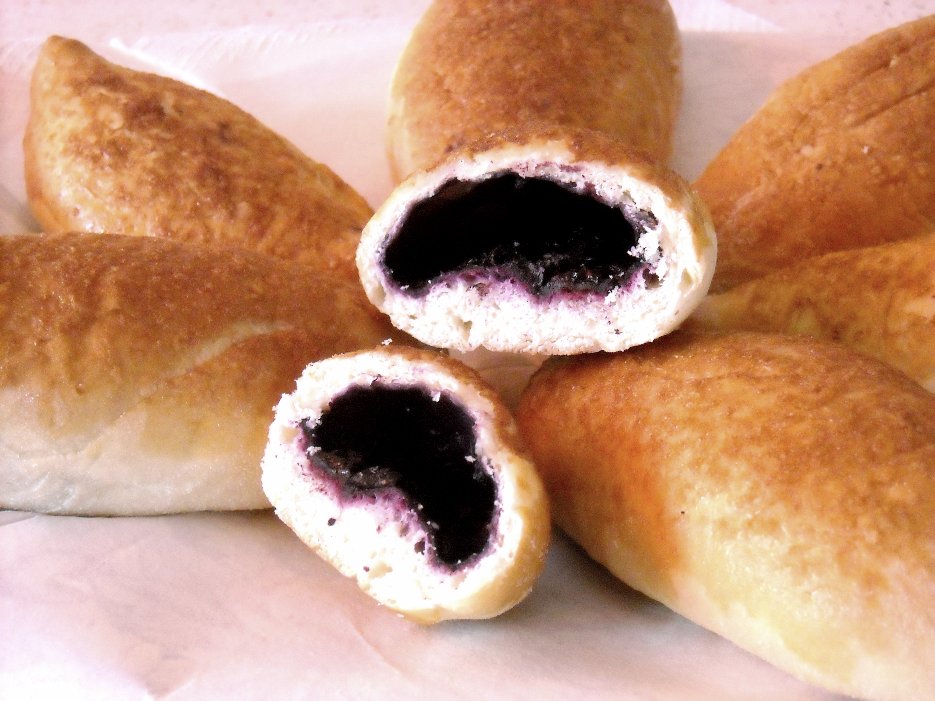 4. Wyrośnięte ciasto cienko rozwałkowujemy, a następnie wykrawamy z niego krążki (ok. 10 cm średnicy). Na każdy nakładamy porcję nadzienia i sklejamy. Układamy na blaszce wyłożonej papierem do pieczenia miejscem zlepienia do dołu.