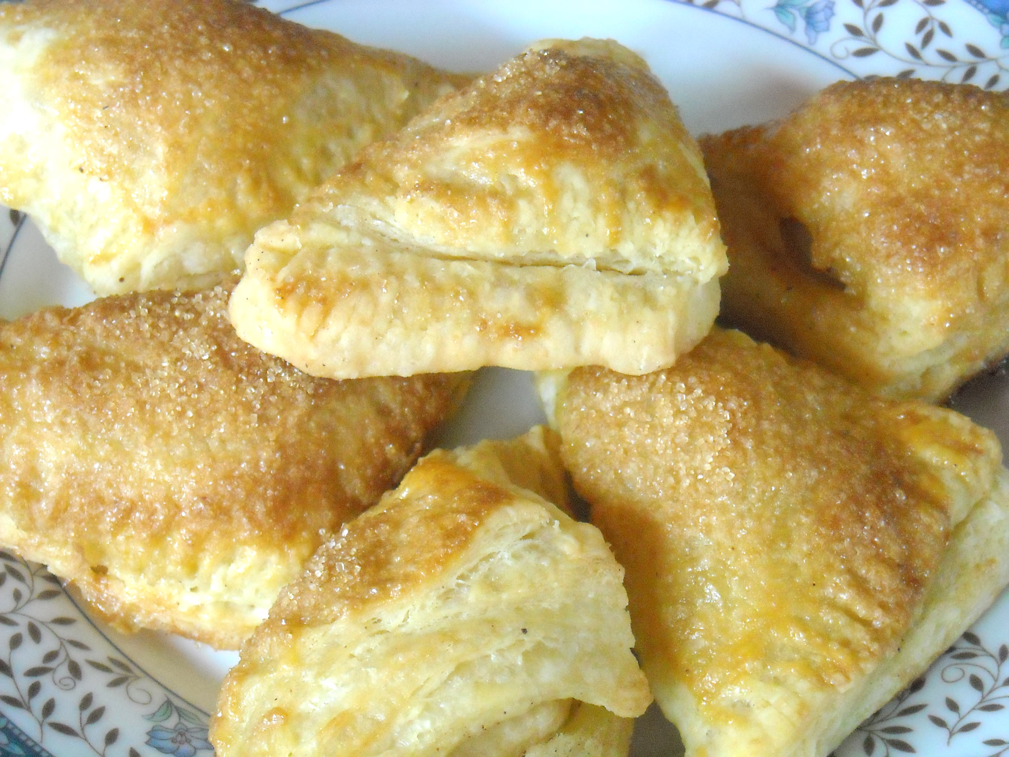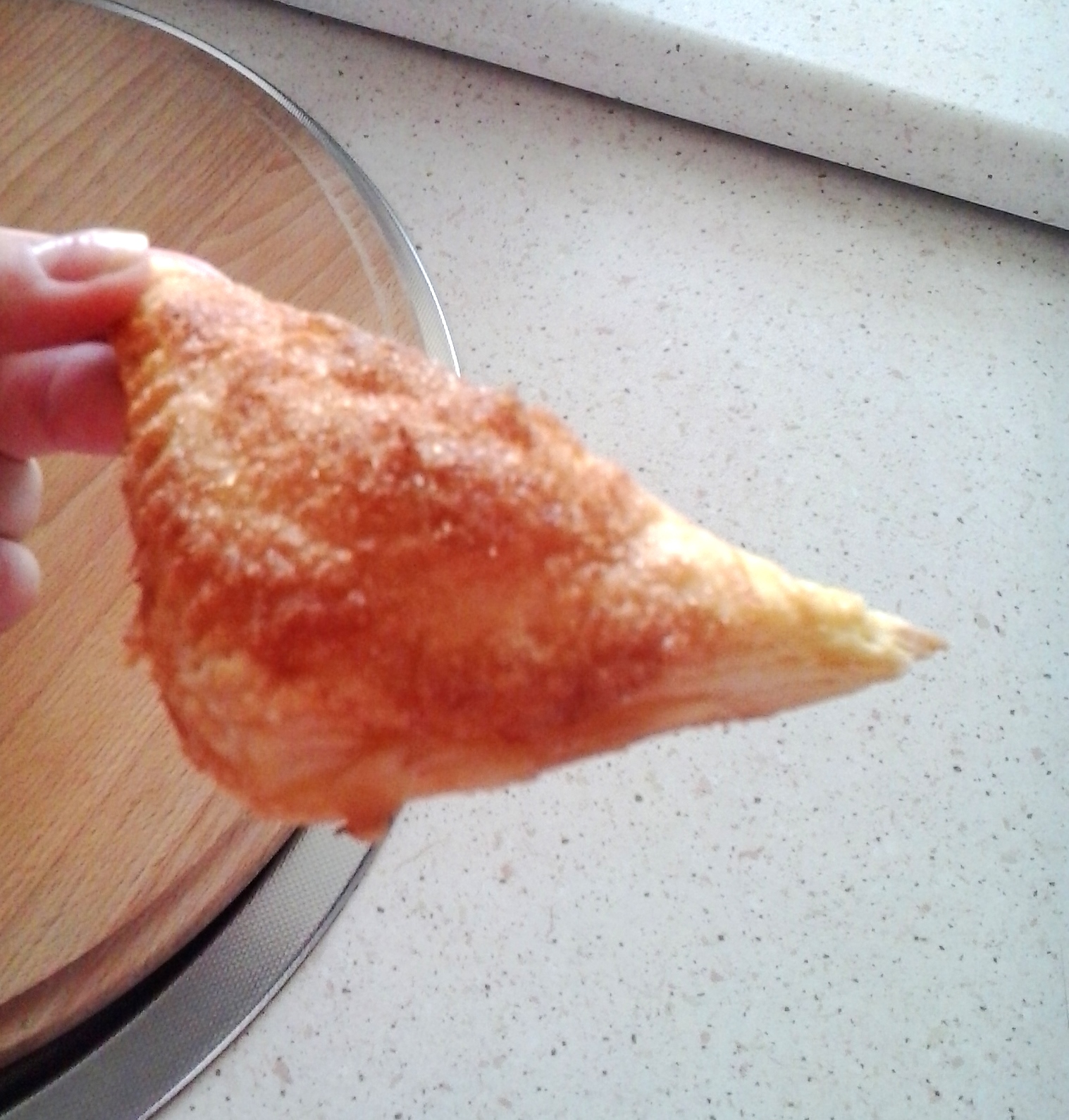 8. Jabłka obieramy, usuwamy gniazda nasienne, kroimy w półksiężyce. Układamy na kwadratach. Ciasto składamy w trójkąty, zlepiamy. Smarujemy jajkiem i posypujemy cukrem. Pieczemy 20 minut w temp. 200 st. C.