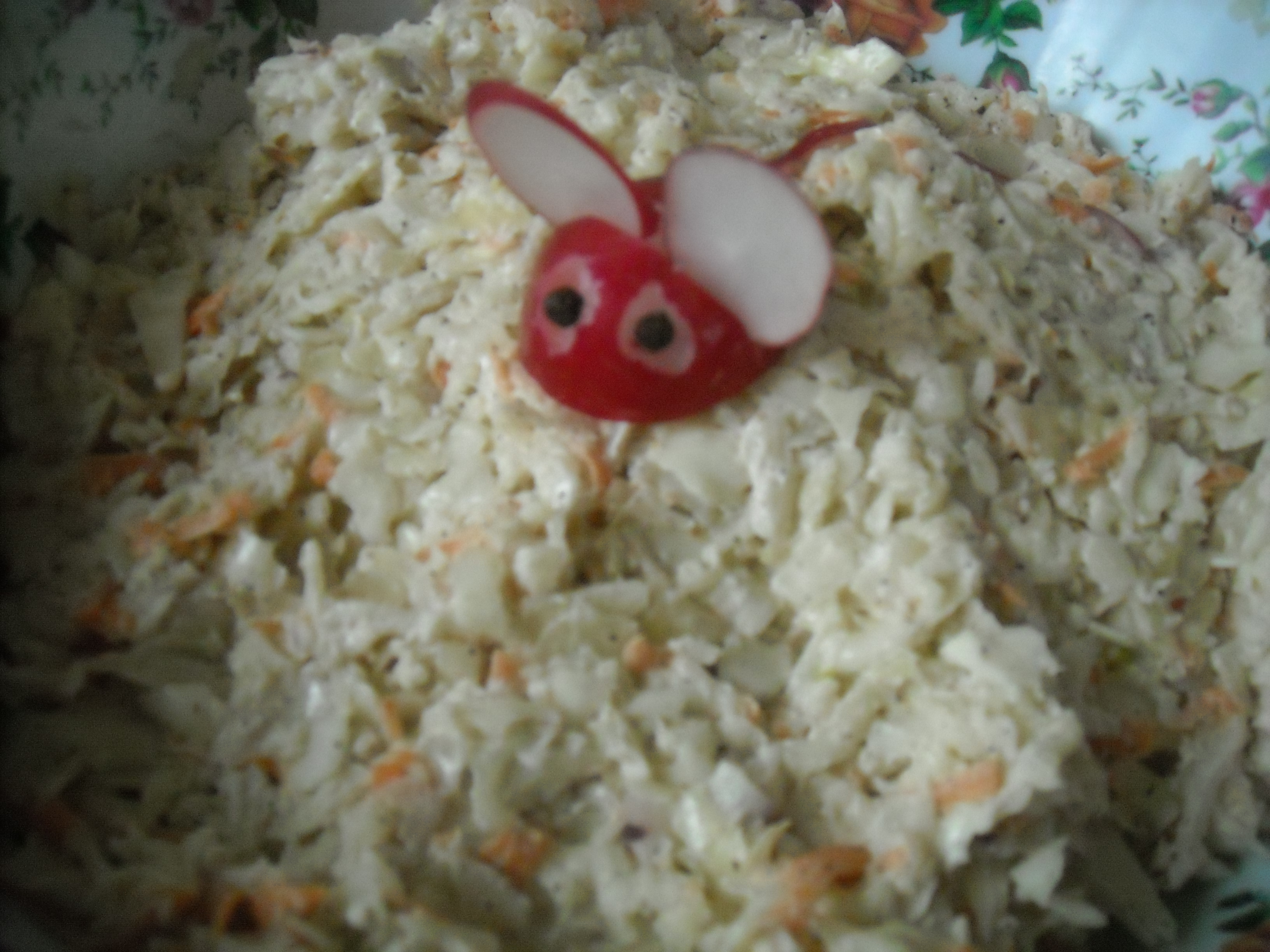 Pokrojoną kapustę mieszamy z pokrojoną cebulą i startą na tarce marchewką. Dodajemy majonez, chrzan, musztardę, kechtup, troszkę śmietany. Doprawiamy solą i pieprzem. Mieszamy.