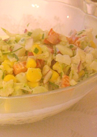 1. Warzywa myjemy i osuszamy. Szczypiorek drobno kroimy. Ogórka obieramy. Ananasa i kukurydzę odsączamy. Ananasa kroimy w małą kostkę, kapustę w cienkie paski.