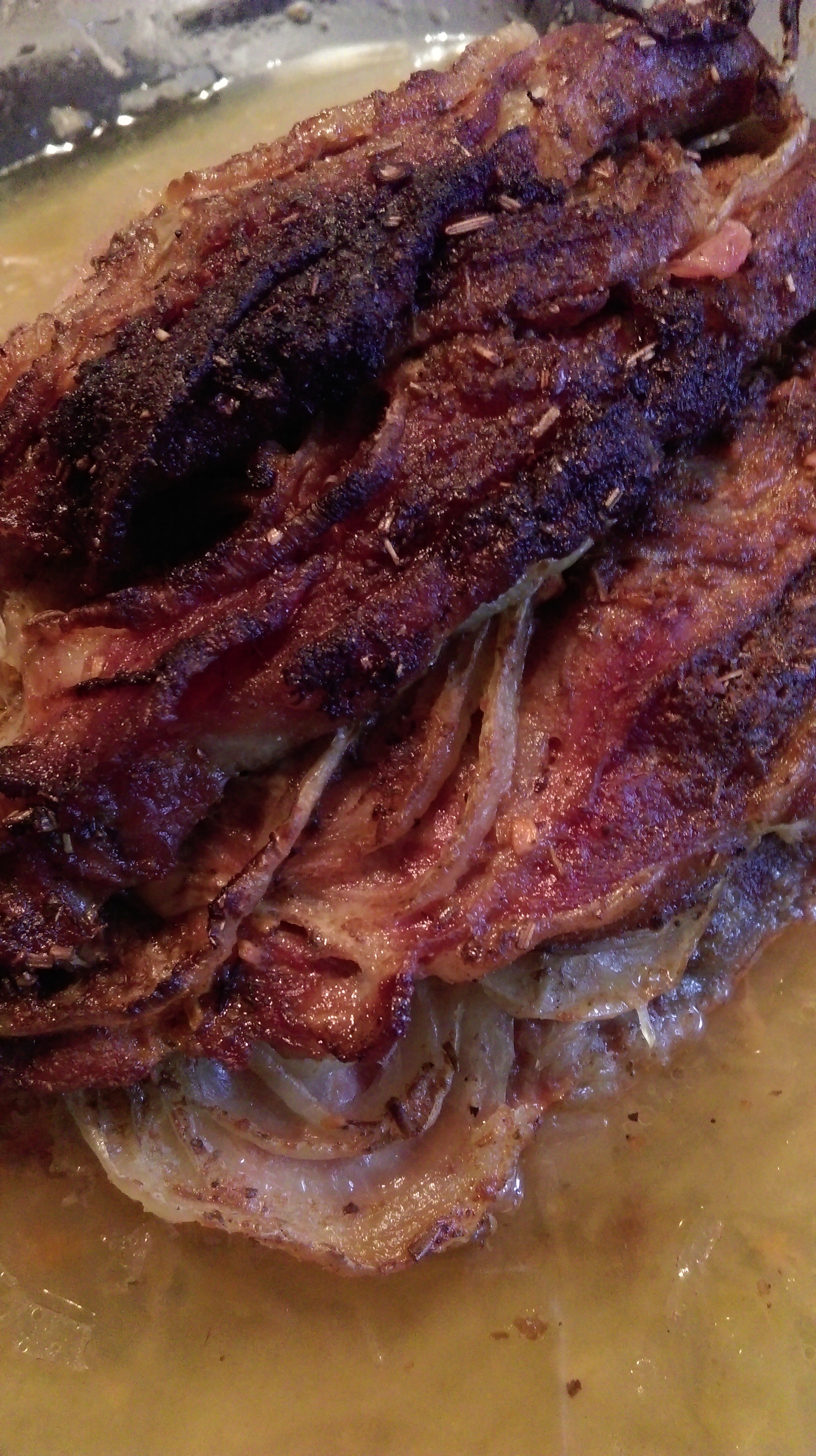Co 1,5 cm karkówkę nacinamy (nie docinając jej do końca). W każde nacięcie wkładamy plaster boczku wędzonego i pokrojoną w piórka cebulę. Przyprawiamy solą i przyprawą do karkówki. Naczynie żaroodporne smarujemy olejem. Na dno wykładamy kapustę kiszoną, a na nią kładziemy mięso. Przykrywamy. Pieczemy w temperaturze 190 stopni Celsjusza około 1,5 godziny.