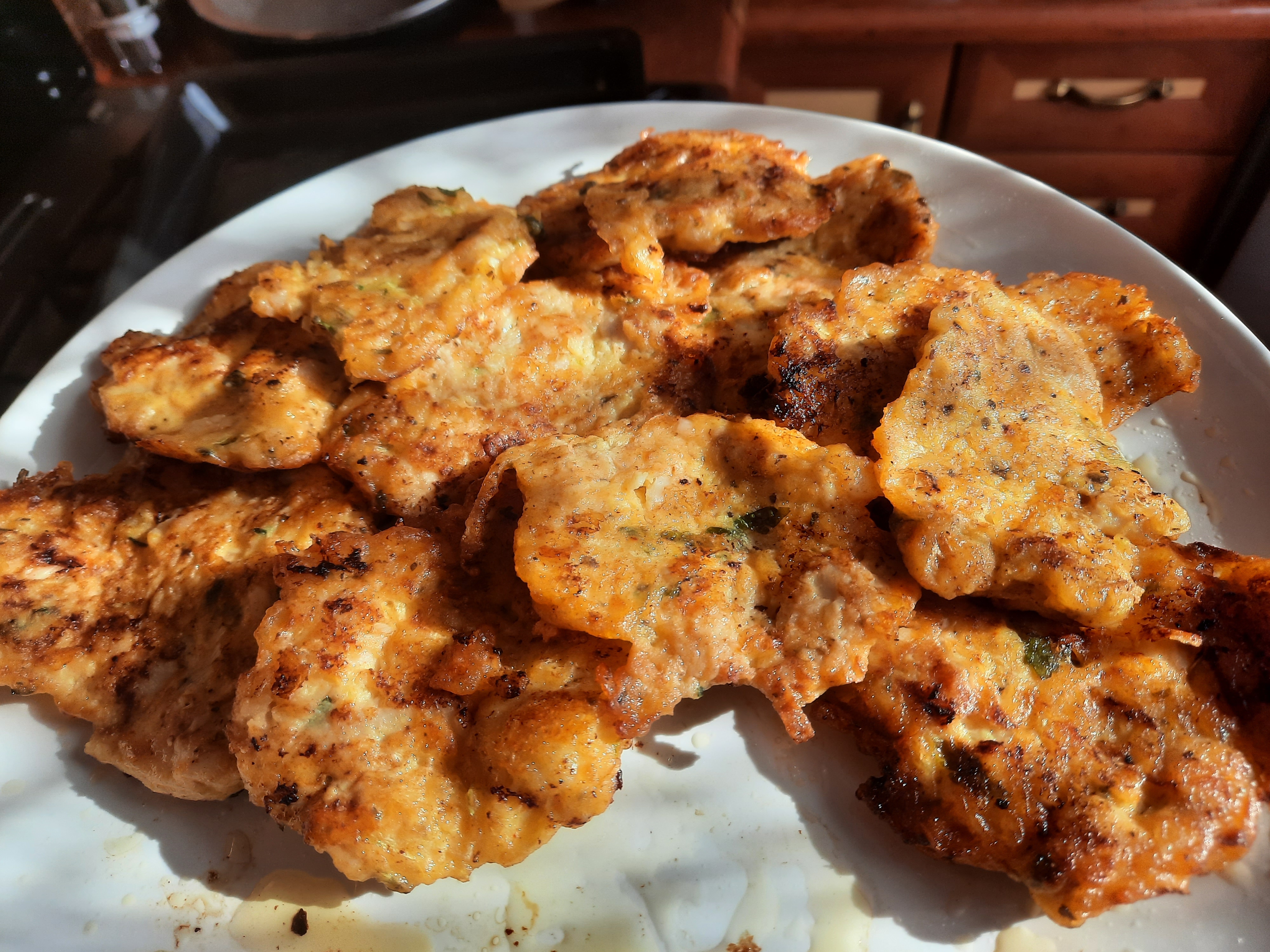 1. Filet pokroić w drobna kostkę. Dodać przyprawy (po pół łyżeczki bazylii, oregano, czosnku granulowanego, 1 łyżeczka papryki słodkie, sól i pierz do smaku). Wymieszać, odstawić na pół godziny.